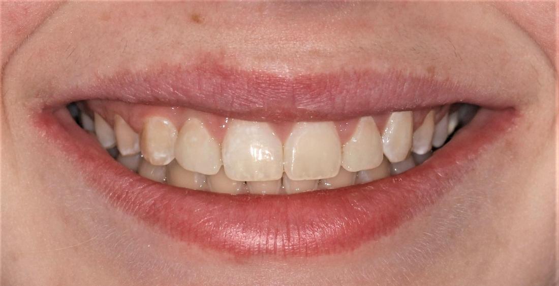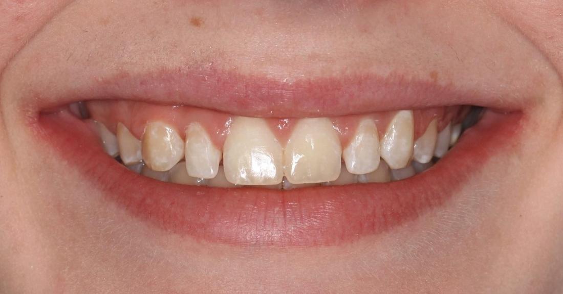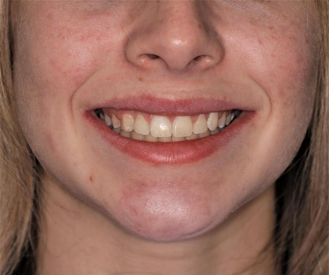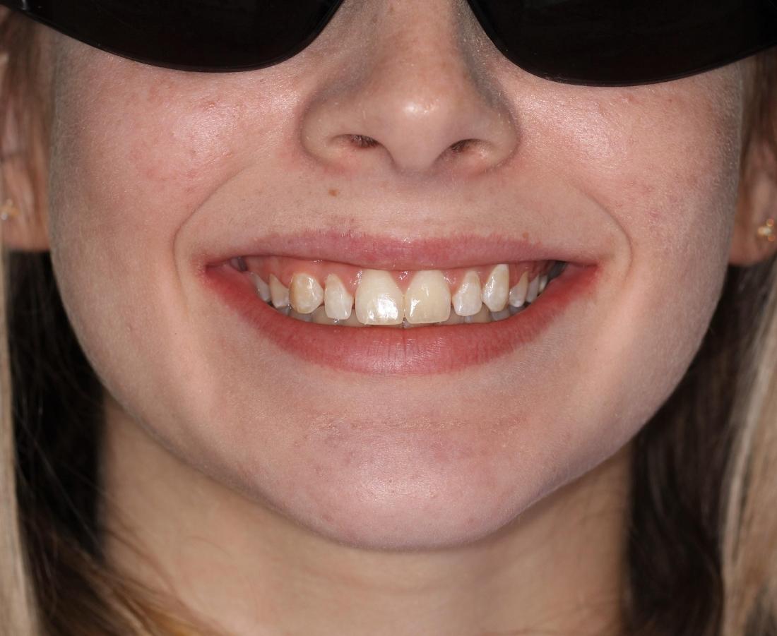 This young patient had disproportionately small upper lateral incisors bonded to ideal dimensions immediately after having her braces removed. 'Bonding' consists of sculpting tooth colored resin chairside in one visit. It is a more timely alternative to lab fabricated porcelain veneers in certain situations.