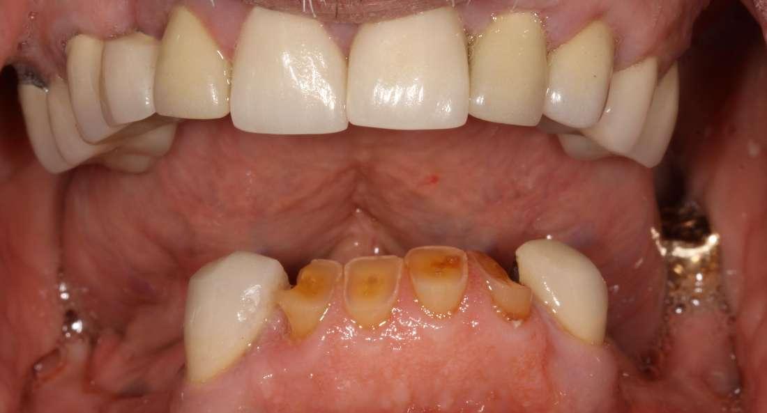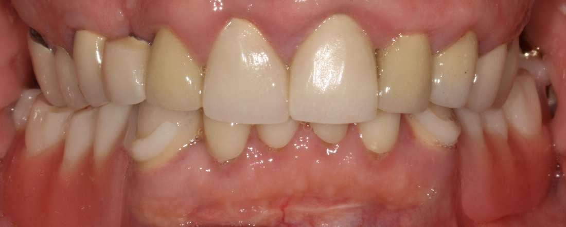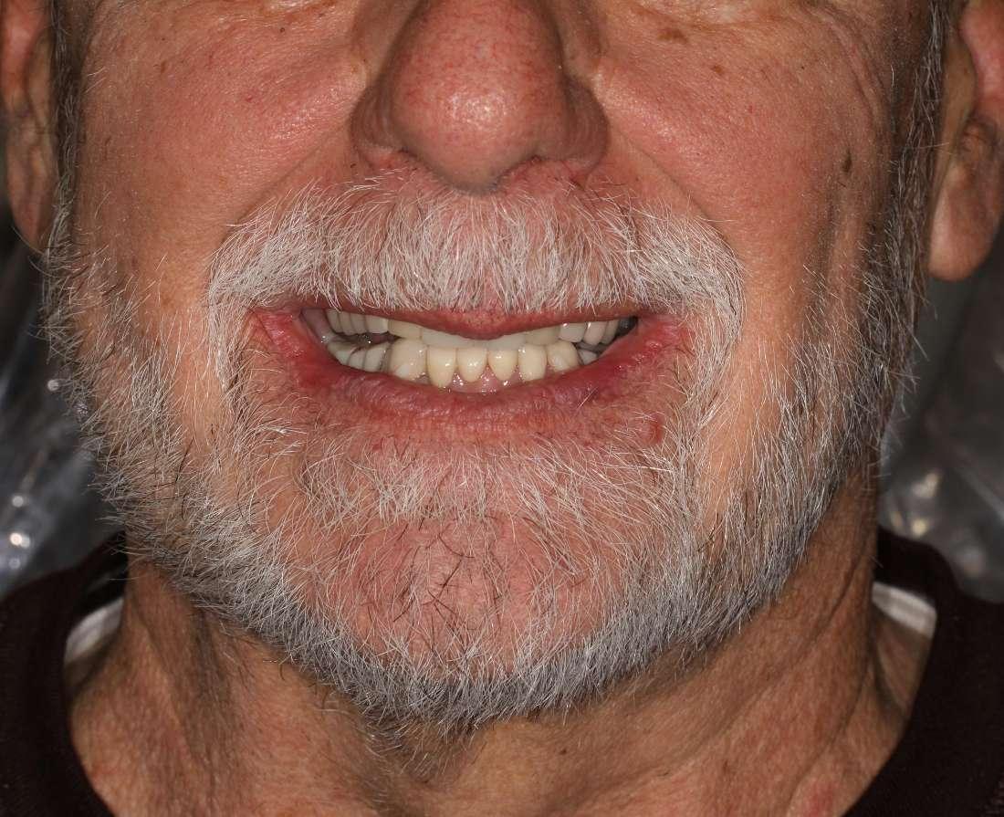 Excessive lower tooth wear due to missing lower back teeth causing shortened front teeth. Treated with crown lengthening gum surgery, new crowns, and a lower partial denture replacing missing back teeth. Patient was very pleased to have his smile and function restored.